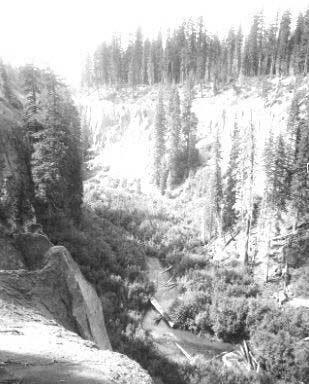 Three and a half miles uphill from the old Klamath Falls entrance to the park is a viewpoint, the Annie Creek Canyon Overlook. It is the first remarkable view tourists come upon inside the park. Here, tourists look across a chasm to the opposite side—a 90° cliff face of gray, volcanic ash. What most don’t realize is that they are standing on a cliff face equally extreme. If you’re brave enough to stand at the edge, you can see all the way to the bottom, three hundred feet down. There, the tiny creek that carved this steep, narrow canyon meanders through a strip of willows and trees fallen down from the canyon above.